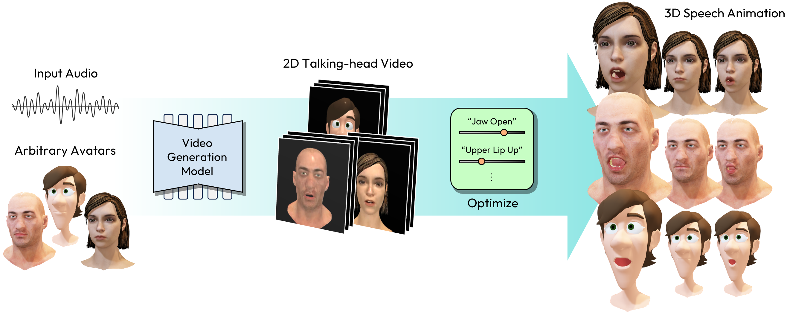 A data-free method that generalizes realistic, lip-synced 3D speech animations for arbitrary characters using video diffusion models.